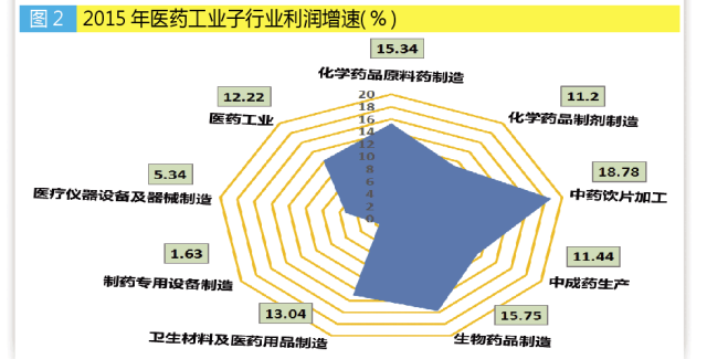 2015年,医药工业规模以上企业实现利润总额2768.23亿元,同比增长12.22%,高于全国工业增速14.52个百分点,较上年下降0.93个百分点。其中中药饮片加工行业全年利润增速高于8类子行业利润增速。