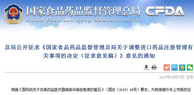 3月17日,国家食品药品监督管理总局公开征求《关于调整进口药品注册管理有关事项的决定(征求意见稿)》意见。全文如下: