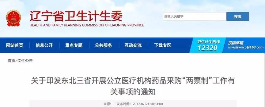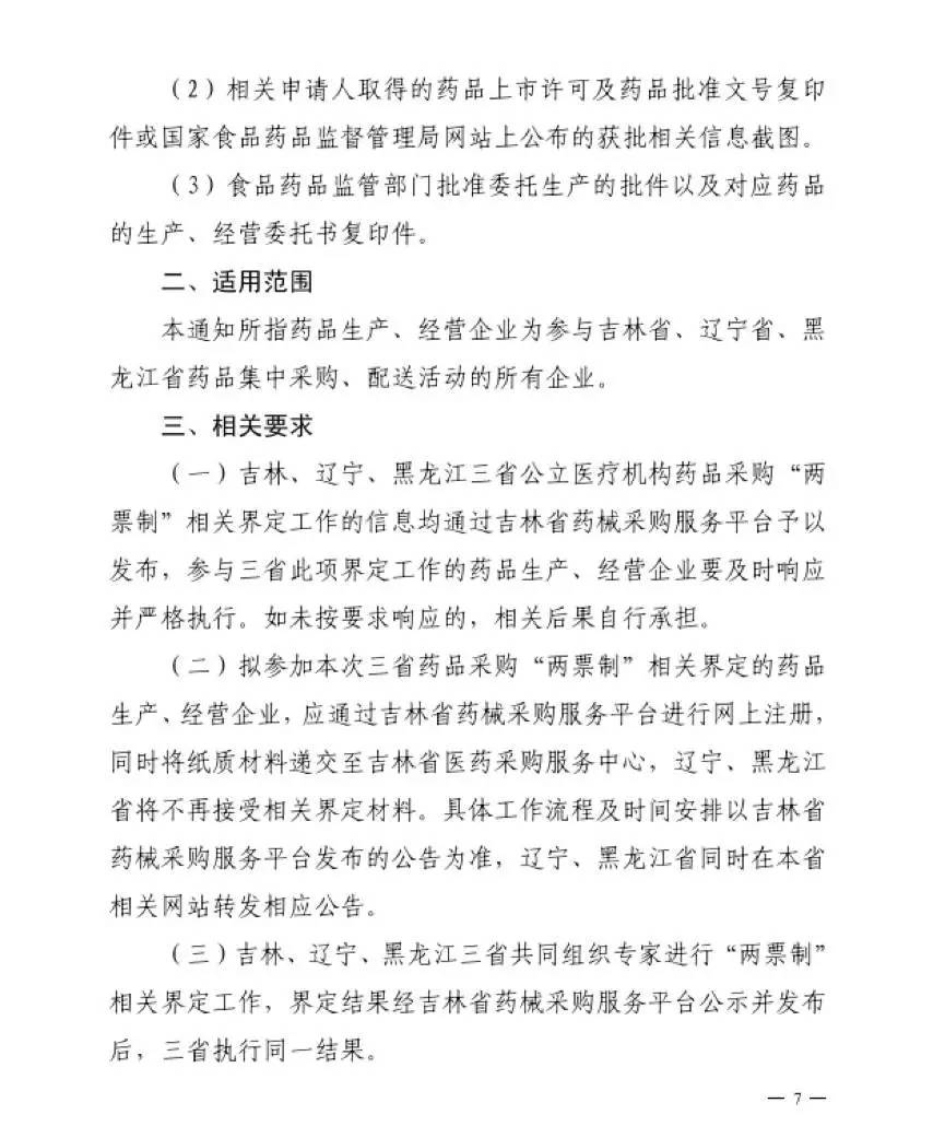 7月21日,在辽宁卫计委官网发布了《关于印发东北三省开展公立医疗机构药品采购“两票制”工作有关事项的通知》,对界定条件、适用范围做了相关规定,要求三省共同组织专家进行“两票制'相关界定工作,界定结果经吉林省药械采购服务平台公示并公布后,三省执行同一结果。