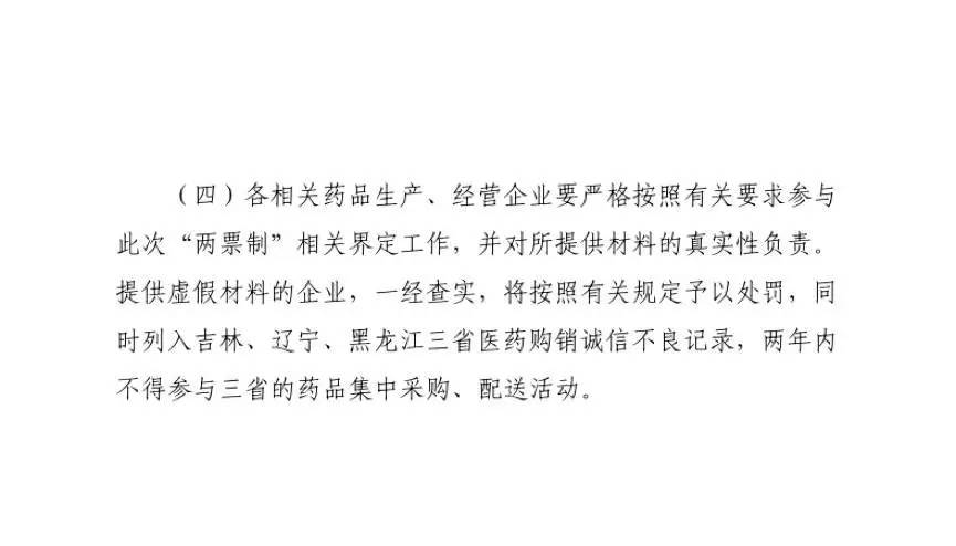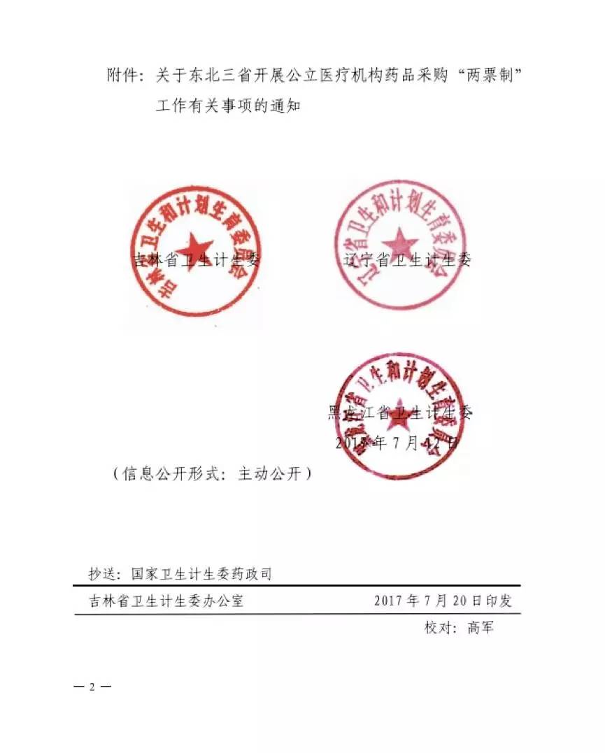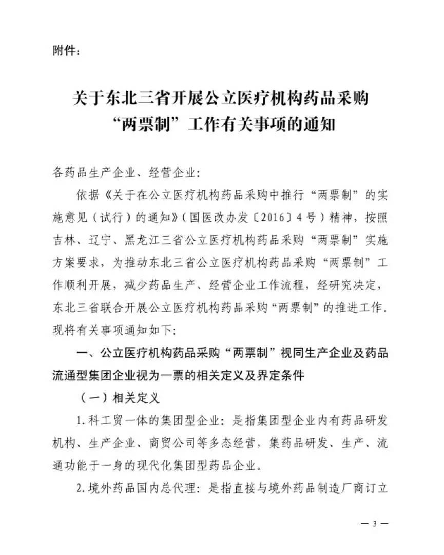 为推动东北三省公立医疗机构药品采购“两票制”工作顺利开展,减少药品生产、经营企业工作流程,经研究决定,东北三省联合开展公立医疗机构药品采购“两票制”推进工作。